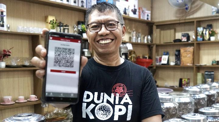 Pemilik Dunia Kopi, Suradi sedang melakukan transaksi menggunakan QRIS di Pasar Santa, Jakarta Selatan, pada Kamis, 8 Mei 2025. TEMPO/Abdul Karim